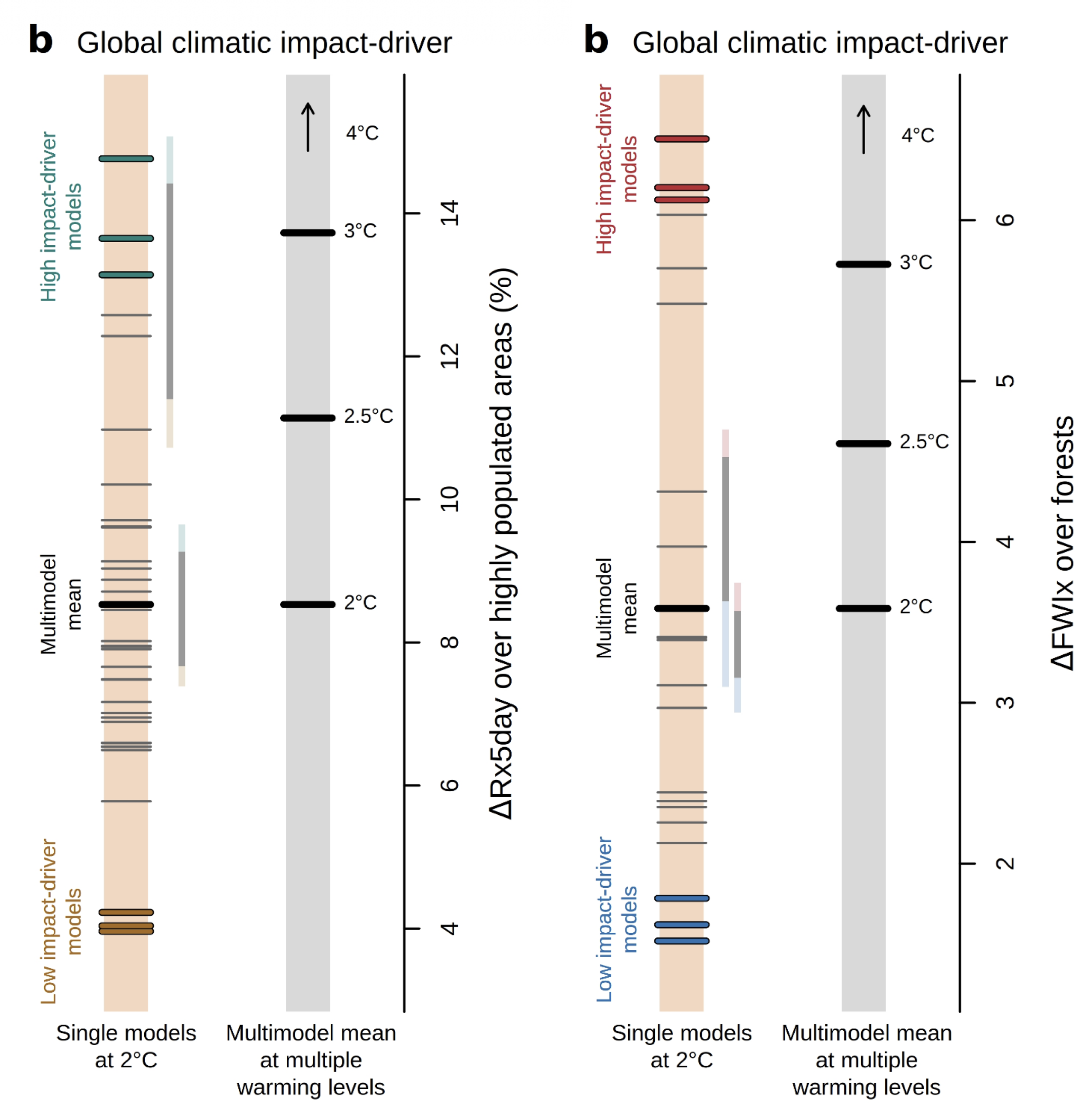 The authors also conduct their analysis for extreme rainfall in populated regions. Although they find a wide range of model results, none of the simulations of extreme rainfall at 2C are higher than the multimodal mean at 4C.